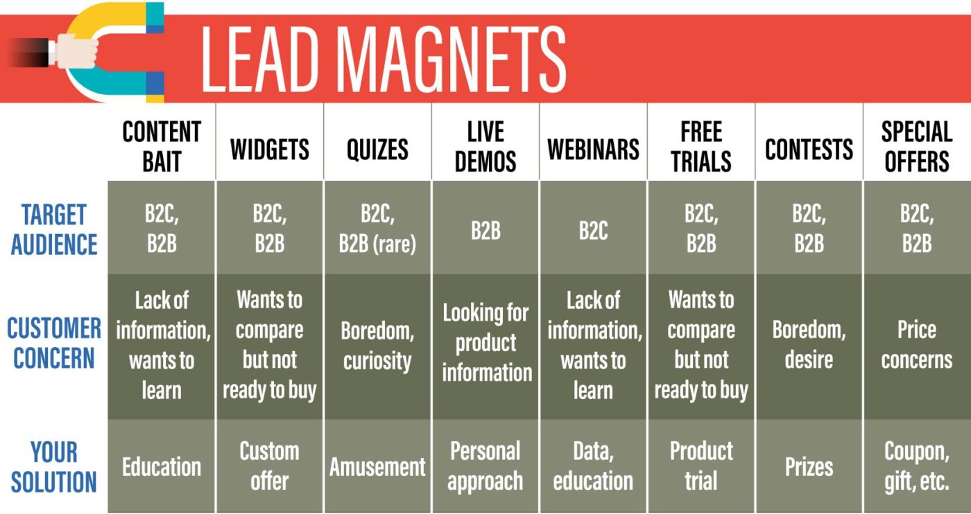 Lead magnets may offer pieces of digital downloadable content like free ebooks, PDF checklists, widgets, quizzes, live demos, video, or free coupons.