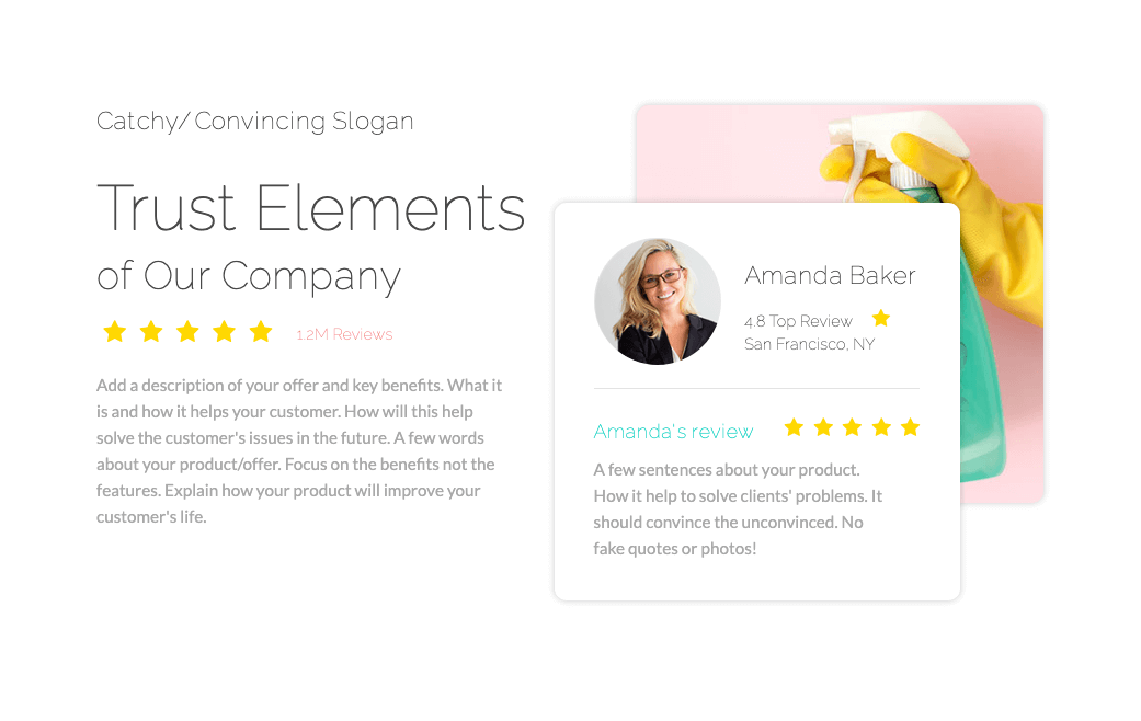 Note that our brains process stock photos and original photos in a different way, the latter being given much more attention to. Even the not-so-ideal photos of genuine products are way better than the ones from stock (which make every landing page look pretty generic and not evoking trust at all). Consider adding photos made by the clients themselves – they will feel genuine and help you gain the visitors’ trust.