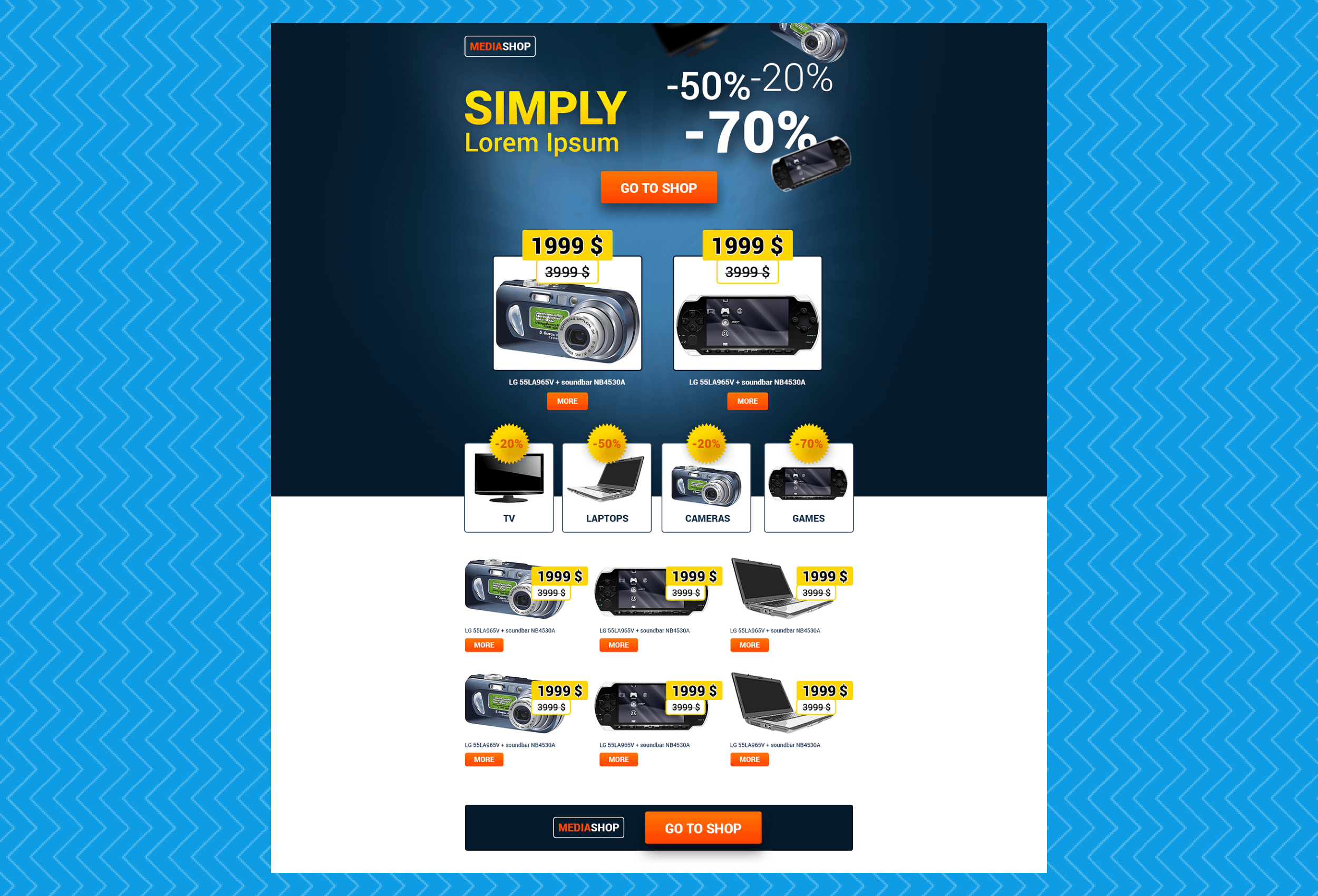 The first template can be used for presentation of the entire current special offer of your shop. The landing page will, in this case, serve as a transitional page that should encourage the visitor to proceed to the shop, where the action can be realized. An advantage of this template is that you can present here your entire offer, without adding links to other sections of the shop. It will make the visitor concentrate only on the offer that you’ve chosen.