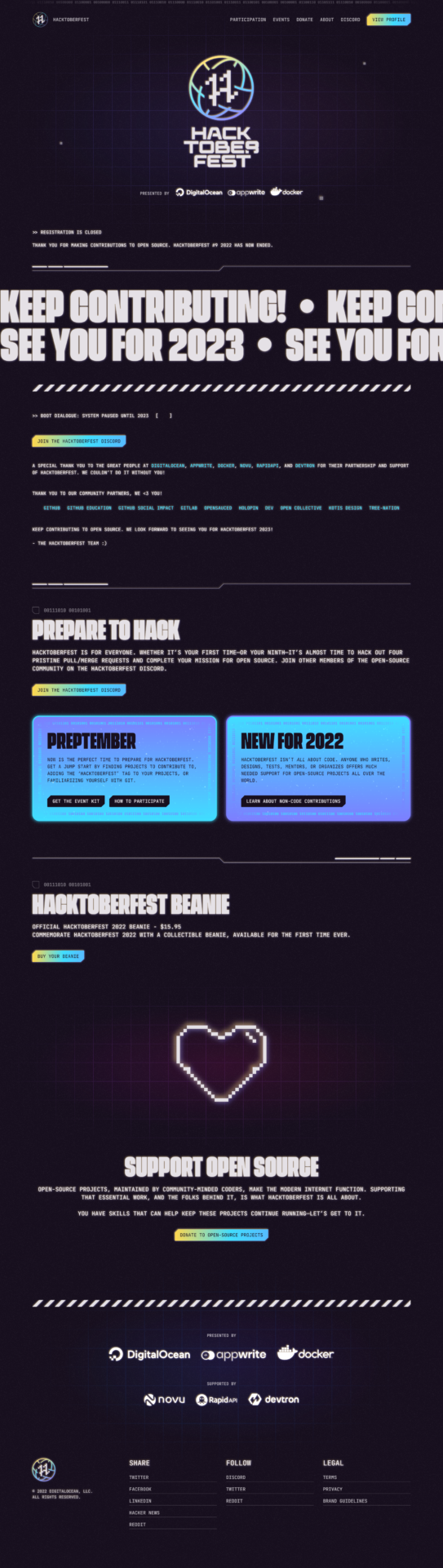 Hacktoberfest draws the visitor’s attention to the countdown timer at the bottom of the page. Once visitors are intrigued, they can learn more by clicking one of the navigation links at the top-right portion of the landing page.