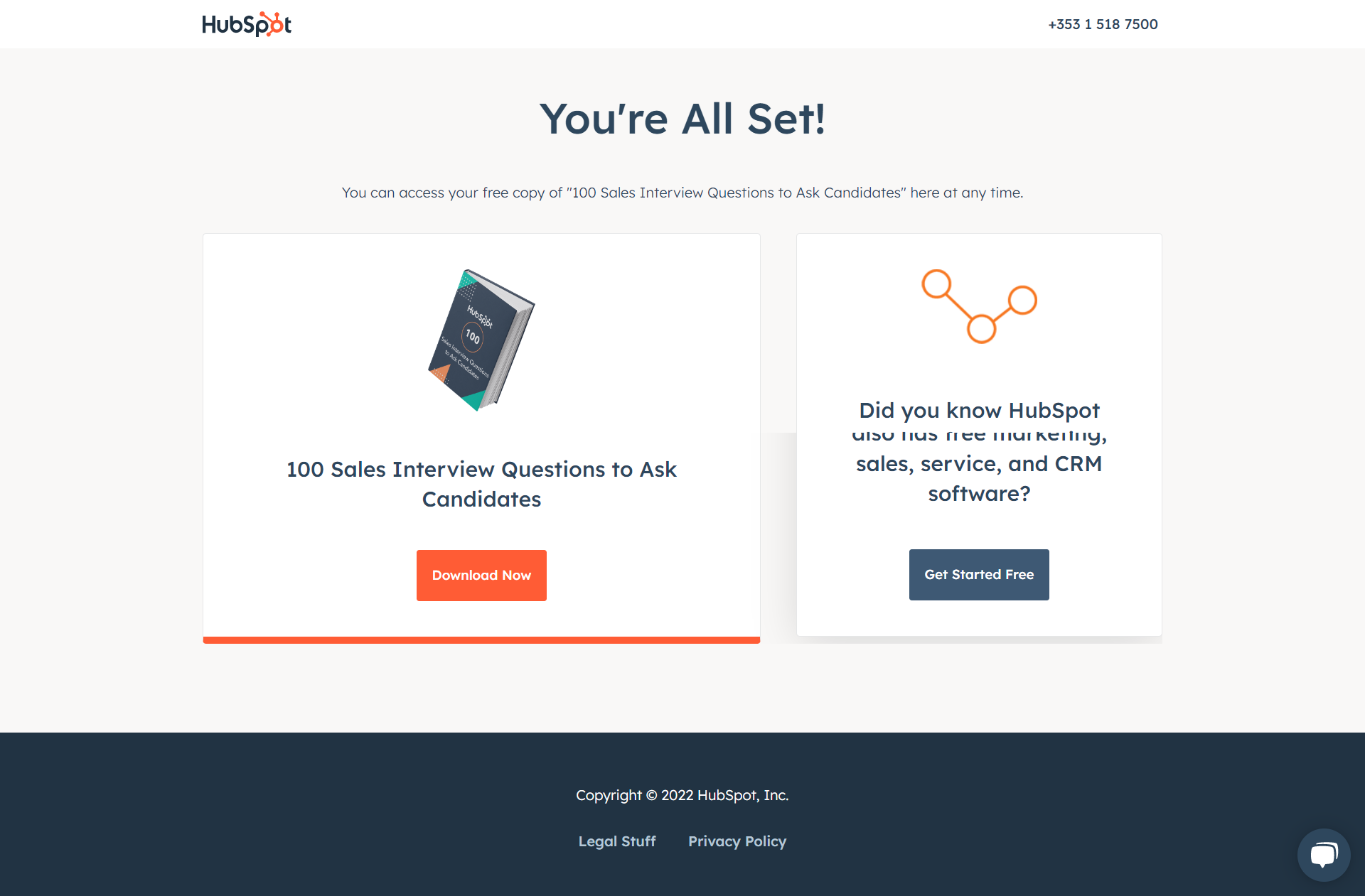 After downloading the guide, visitors are invited to try one of HubSpot’s free products. This way, HubSpot aims to better familiarize prospects with its products, thus increasing the likelihood of turning them into customers.