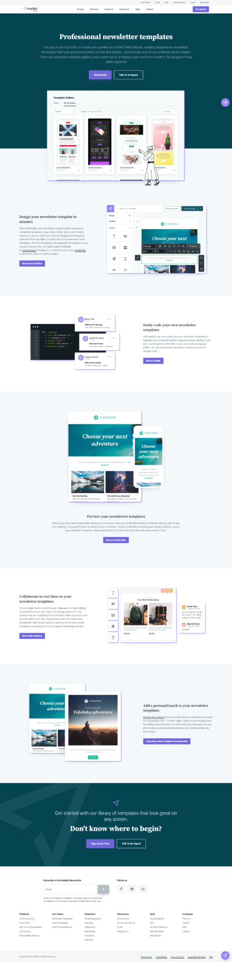 Mailjet is an excellent example. The headline states exactly what the platform offers, while the supporting copy briefly explains why you need it and how it works. The CTA pops out from the rest of the web page, grabbing the users’ attention.