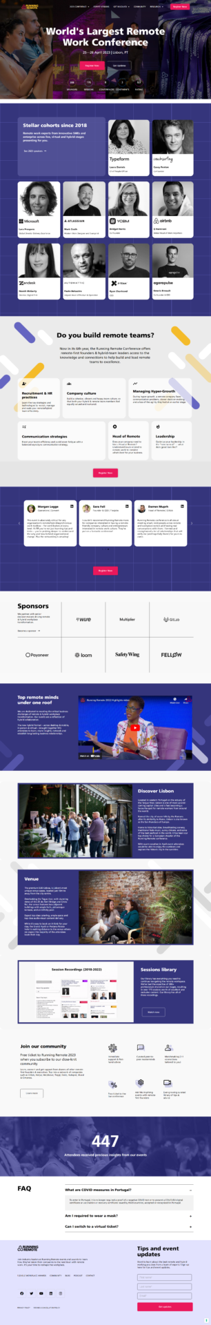 Running Remote uses photos from previous events as their backgrounds. This way, users can get a quick idea of what the event will be like. The CTA in contrasting colors further nudges them to convert.