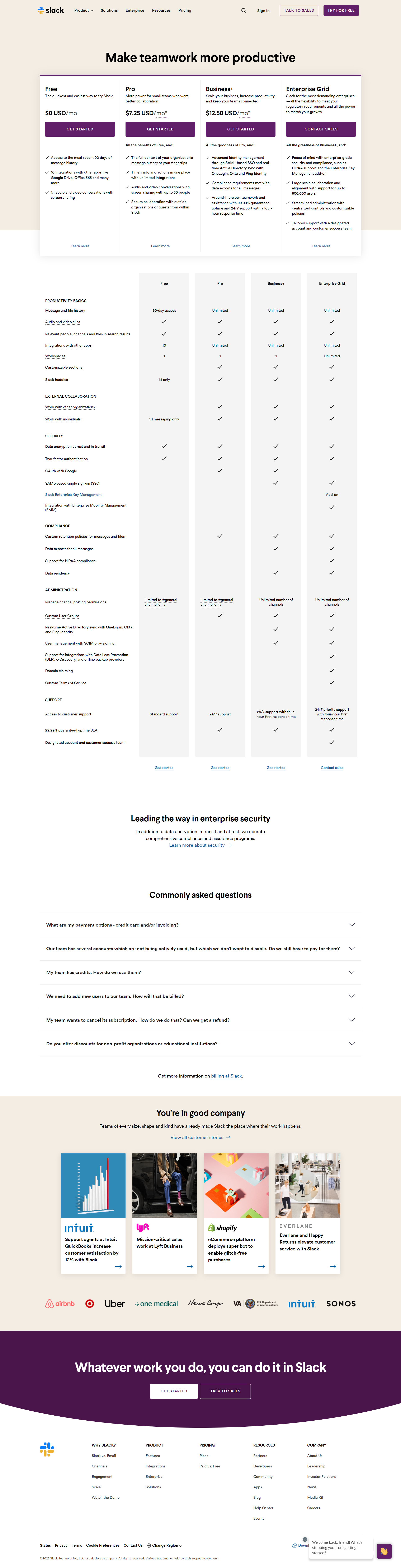 Slack is a great example. It briefly describes who each pricing plan is best for, while the difference between packages is highlighted clearly. Visitors can find out more details about each pricing tier’s features by scrolling further down the page.