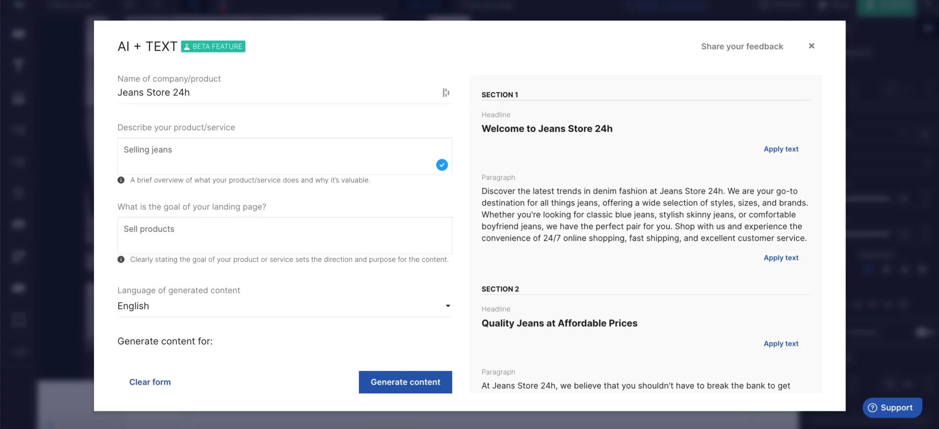 To save some time, you may use copy generators like popular Chat-GPT, but good landing page platforms have built-in tools for that purpose. They generate headlines, taglines, and paragraphs, taking into account predefined target group characteristics. Of course, generated copy requires a human’s final touch to sound perfect, but either way, it can save you lots of time.