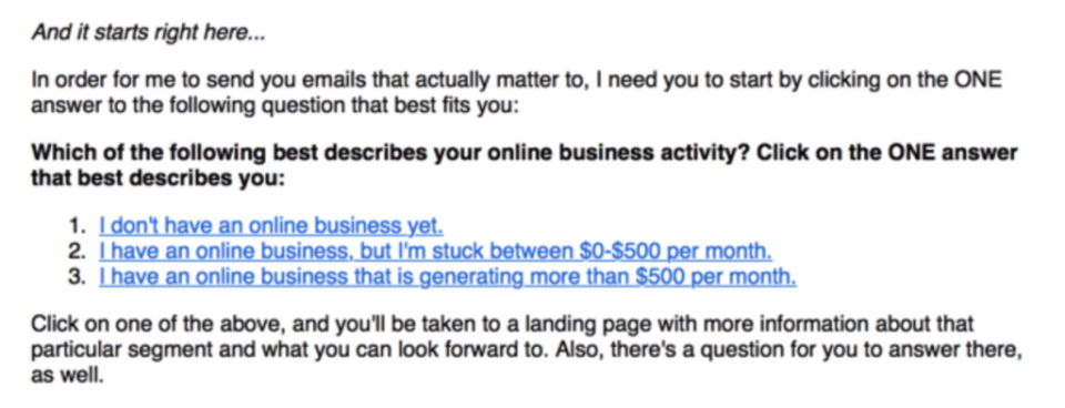 This is the email Pat Flynn sent to his subscribers to segment them according to their preferences: