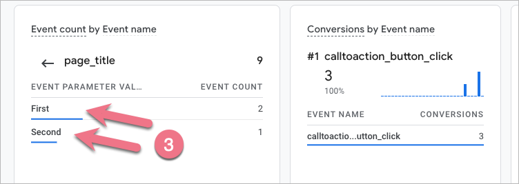 6. From now, your Google Analytics 4 will be capable of tracking two button-click events. You will see the first data in GA4 right away in Reports > Realtime > Event count.