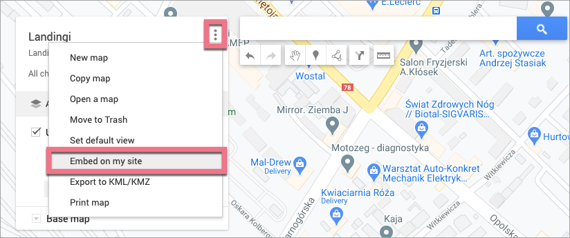 6. Now, you will see the name of the map in the upper left corner. Click on the three dots icon and select Embed on my site from the dropdown list. Copy the displayed HTML code.