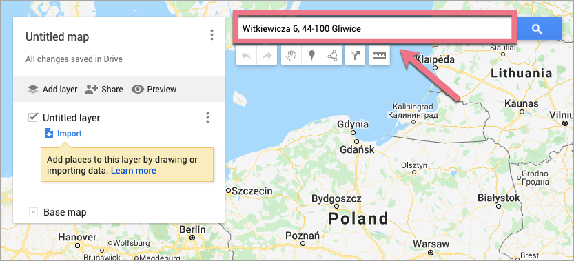 1. Go to Google My Maps. Proceed and click the red button Create a new map.