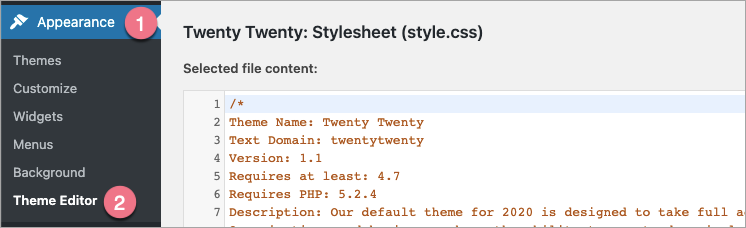 3a. Go to your WordPress dashboard. In the menu on the left, navigate to the Appearance (1) tab and click Theme Editor (2).