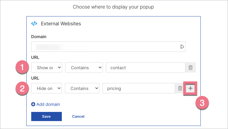 2. To not display pop-ups on selected subpages, choose Contains and Hide on. Type the subpage path.