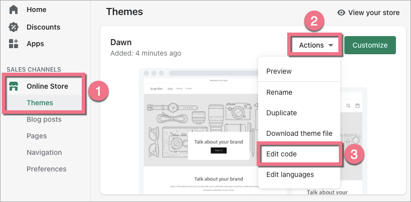 2. On the left side menu, click Online Store and then go to Themes (2). Then select Actions and Edit code (2).