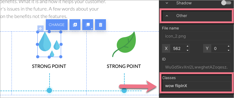 3. In the widget toolbar on the right, find the Other tab and enter the name of your animation in the Classes field. It should be preceded by the command ‘wow’ and one space, e.g., wow flipInX. Do this same for every element that you want to animate.