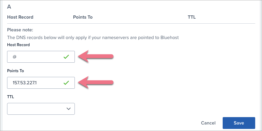 1. Add two A records: one for your root domain and one for the www subdomain. If you already have these records, edit their values.
