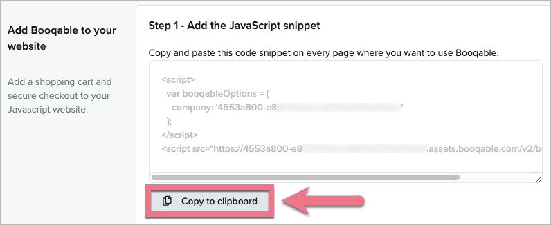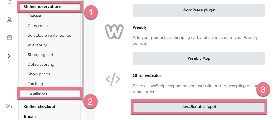 3. In the Online reservations (1) tab, select Installation (2). Click JavaScript snippet (3) under the Other websites section.