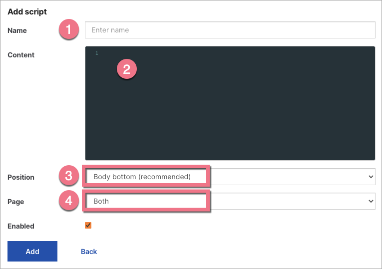 3. Type in a name (1) and paste the snippet in the Content (2) field. Choose Body bottom (3) position on Both (4) pages. Click on Add.