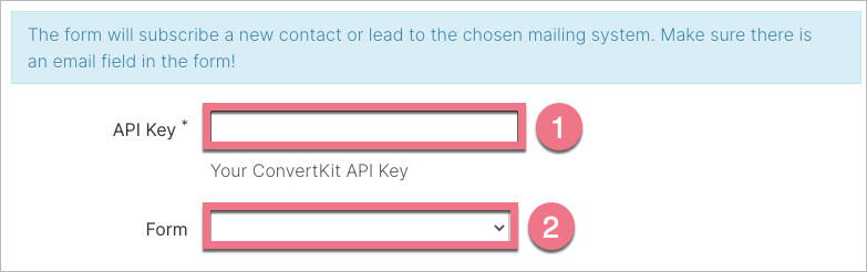 4. Paste your key in the API Key field (1). The Form (2) tab will update automatically with forms previously defined in the Kit platform (leads will be sent to the selected form).