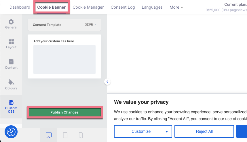 6. At any time, you can customize your banner in the Cookie Banner tab. Remember to Publish Changes.