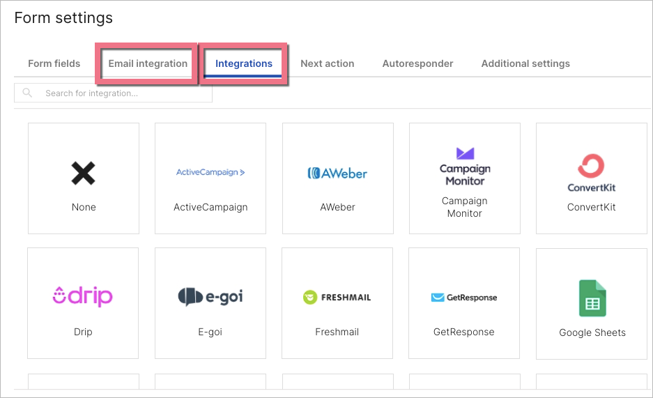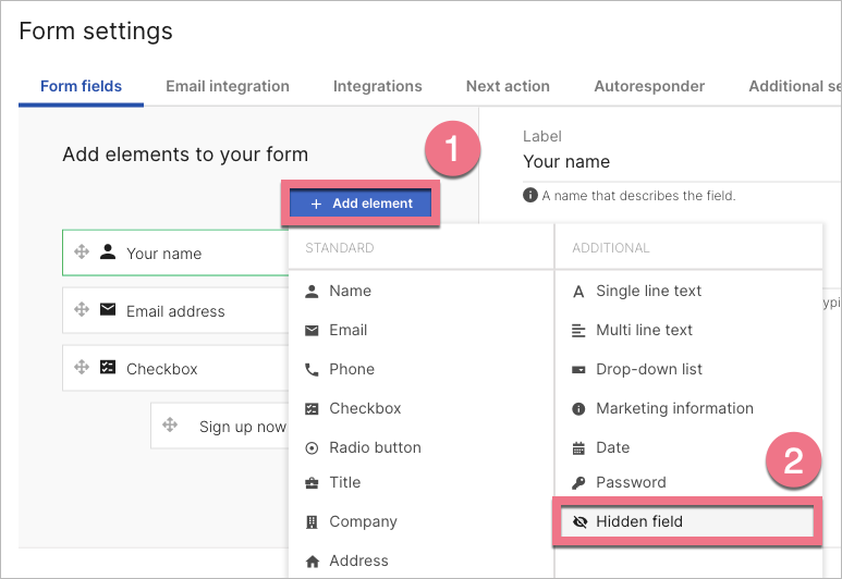 2. Navigate to Form settings. Click Add element (1) and select Hidden field (2). Then Save & close.
