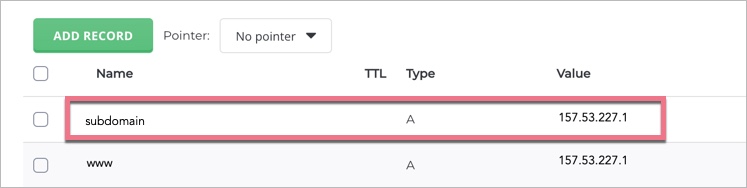 1. Add an A record for the subdomain you want to add to Landingi. If you already have this record, edit it using the pencil icon (and change the Type if set to CNAME).