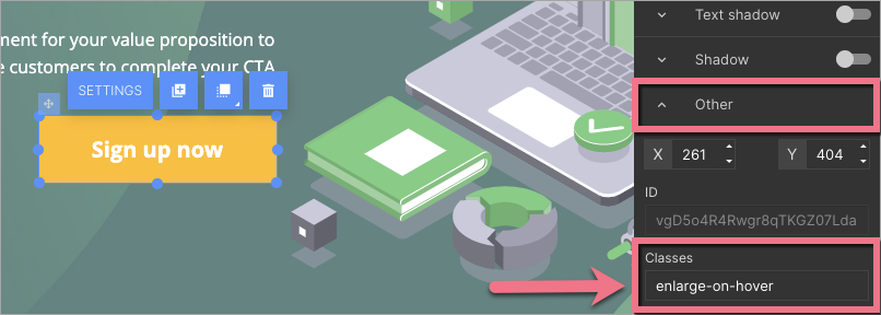 2. Click on a widget and in the right-side toolbar, find the Other tab. Enter enlarge-on-hover in the Classes field.