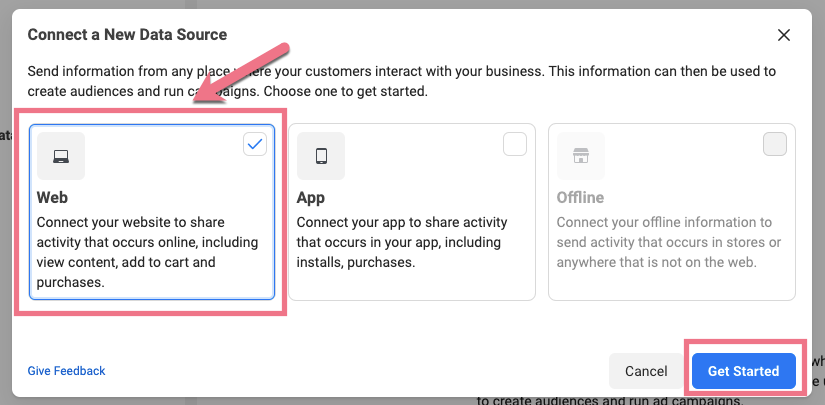 10. In the Set up action section, choose Website as Action Source, select a business account and the pixel.