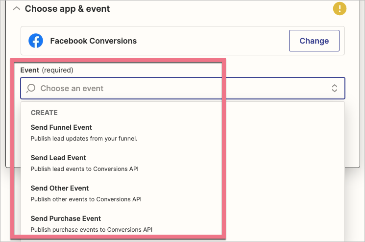8. Now, you can define the details of your event. Search for Facebook Conversions and select the event from the drop-down menu.