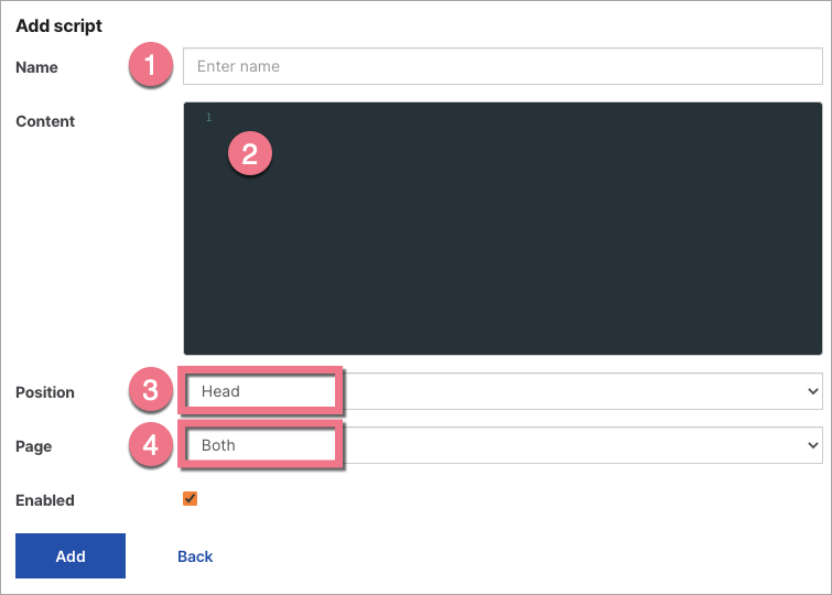3. Name (1) your script and paste the snippet in the Content (2) field. Choose Head (3) position on Both (4) pages. Click on Add.