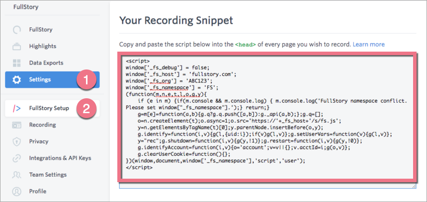 2. Go to Settings (1) and choose FullStory Setup (2).