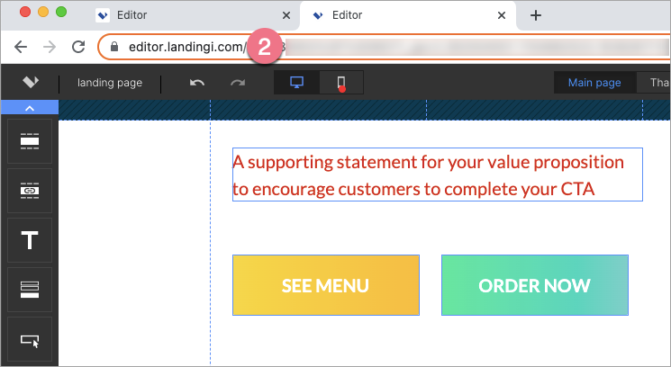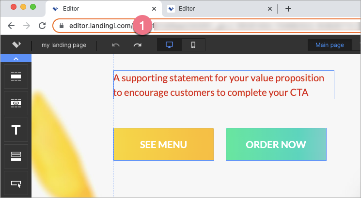1. Log in to your Landingi account and go to the editor of the first landing page.