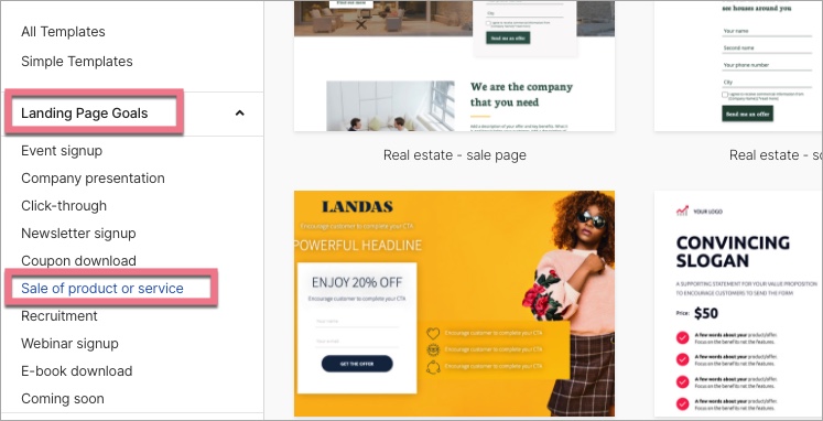 Each time you create a landing page, you’re asked if you want to use a template or upload your own landing page. If you pick a template, you can filter the templates by the goal of your landing page. Make sure to take a look at templates from the Sale of product or service section. You can browse and preview all templates even before you create an account.