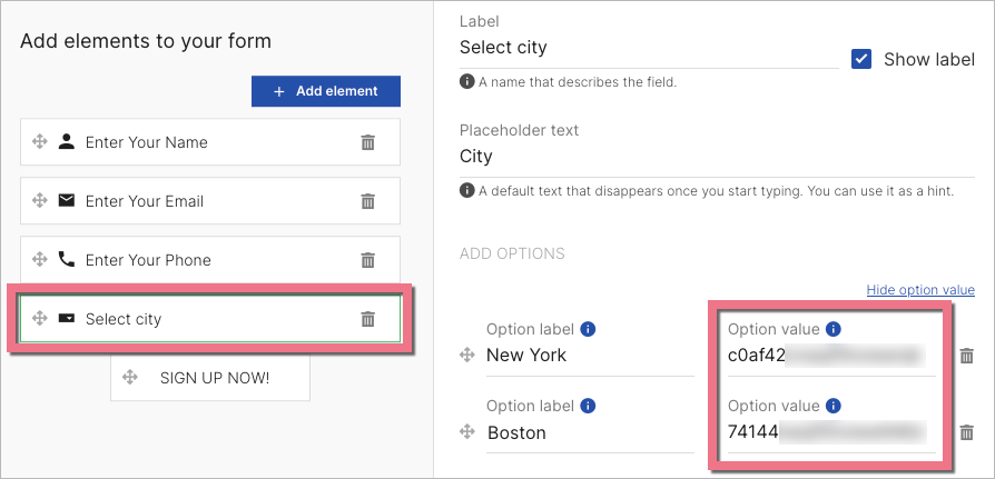 NOTE: If you want to use the Drop-down list fields in your form, you’ll need to define the Option values as IDs of each item in a Creatio lookup. For example, if you want to create a drop-down list with cities, you’ll need to define IDs from the City lookup.
