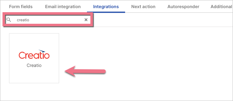 3. In the Integrations tab, select Creatio. You can use the search bar to look for the integration. Type the name and press enter.