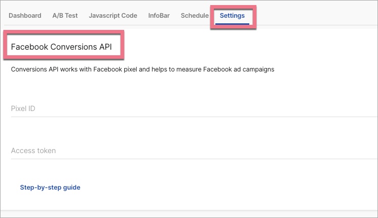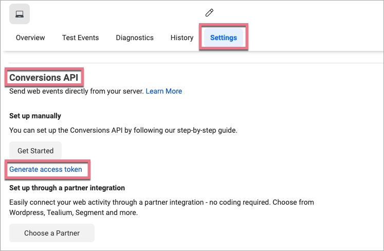 4. To copy the token, scroll down the Settings section and find Conversions API. Click on Generate access token and copy it.