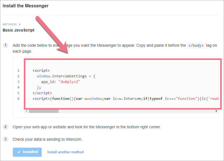 4. Publish your landing page. Go back to Intercom and click on Installed.