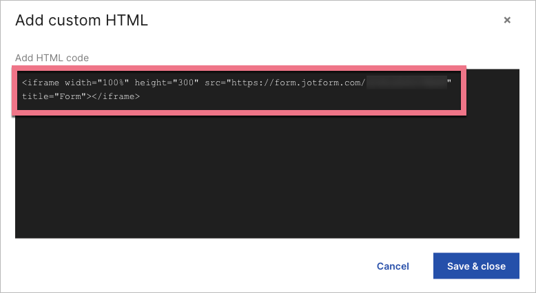 5. Paste the code in the Add HTML code field. Change YOUR_JOTFORM_LINK to the link copied from Jotform. Adjust the width, height, and title values to your needs. Then Save & close.