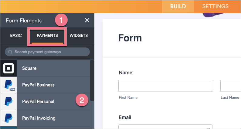 2. To add a payment gateway to your form, select Payments (1) and choose one of the integrations (2).
