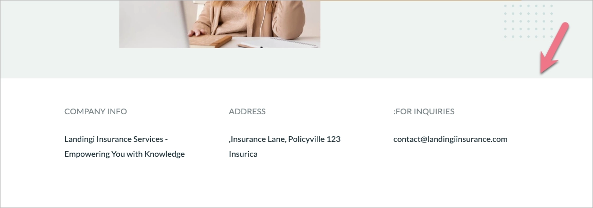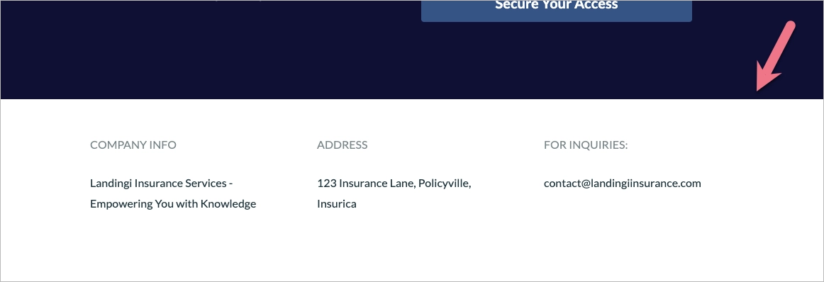 Footer containing contact information. When necessary, you can quickly update the address and phone number on all landing pages where this Smart Section is placed.