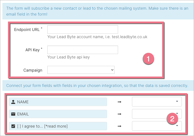 4. In the API Key field, paste your key copied from LeadByte and enter other data (1). Then connect the form fields with the corresponding fields in LeadByte (2).