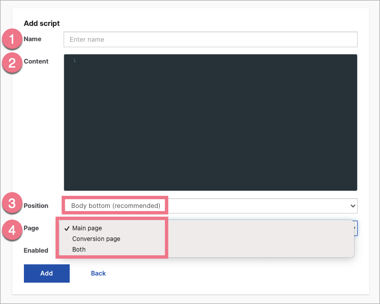 3. Type in a name (1), paste your code (2), and select Body Bottom (3), and select where you want the chat box to pop up (we recommend selecting the conversion page) (4). Click on Add.
