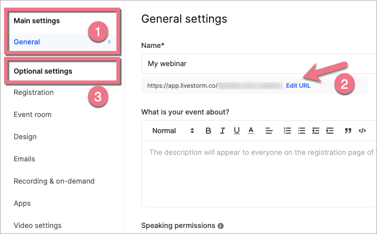 4. Go to General settings (1) and copy your event URL (2). In Optional settings (3), you can personalize, e.g., the design of the registration page or event room settings.