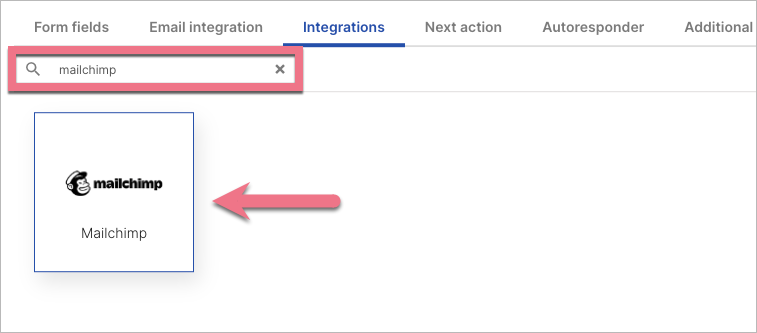 3. In the Integrations tab, choose MailChimp. You can use the search bar to look for the integration. Type the name and press enter.
