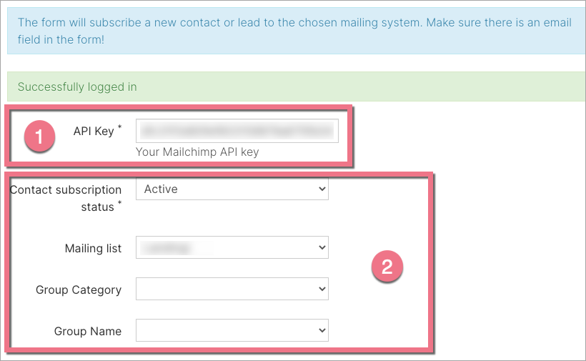 The rest of the fields (2), previously defined in the MailChimp platform, will load automatically after successful login. You can change them at any time.