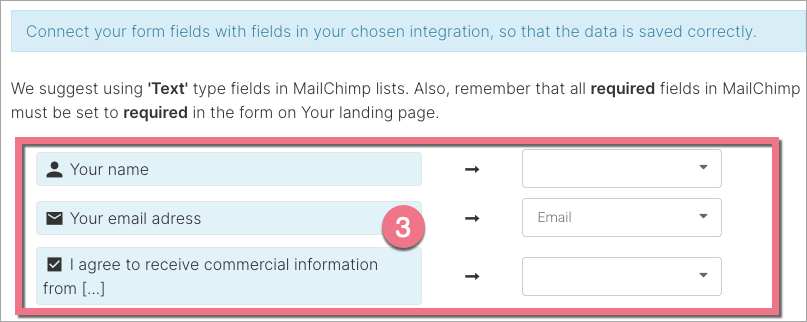 5. Connect the form fields (3) with the corresponding fields in MailChimp. Then click Save and close.