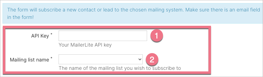 4. In the new window, paste the API key (1) from MailerLite. From the drop-down menu, select your MailerLite mailing group name (2).