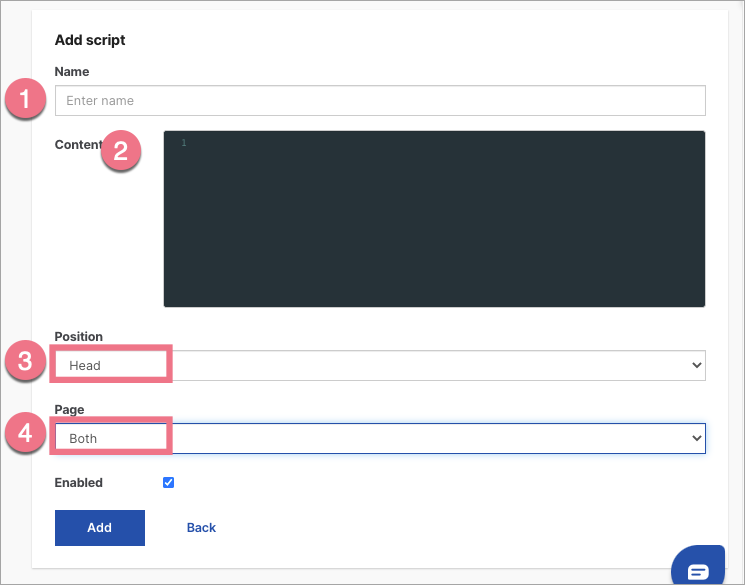 Type in a name (1), paste your custom code (2), select Head (3), and Both (4). Click on Add.