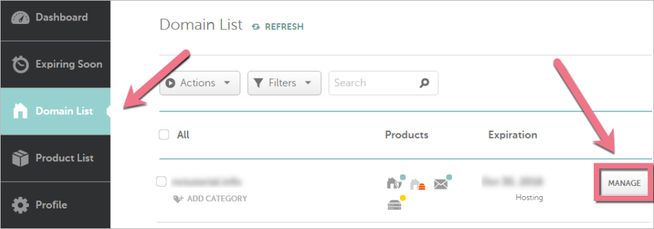 2. Select Domain List from the left sidebar and click on Manage next to your domain.