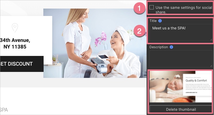 3. You can select Use the same settings for social share (1), and the title will be the same for search results and social platforms, or you can add a different title (2). Upload your thumbnail.