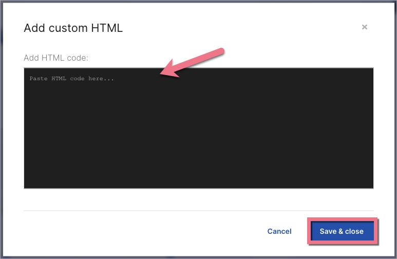 4. Paste the code from OptinMonster in the Add HTML code field. Then Save & close.