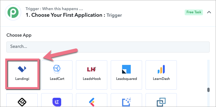 4. In the Trigger section, search for Landingi and click the Landingi icon.